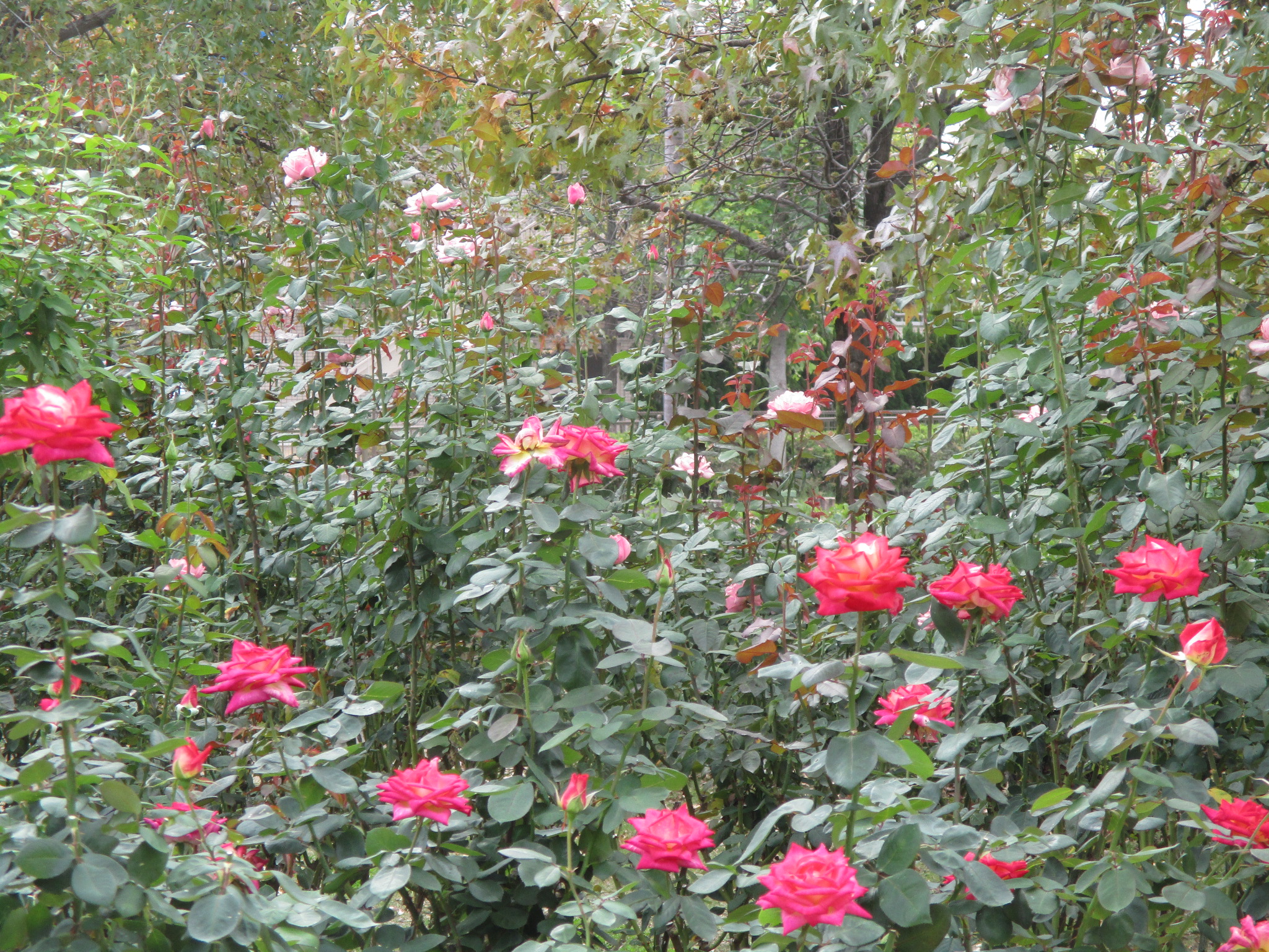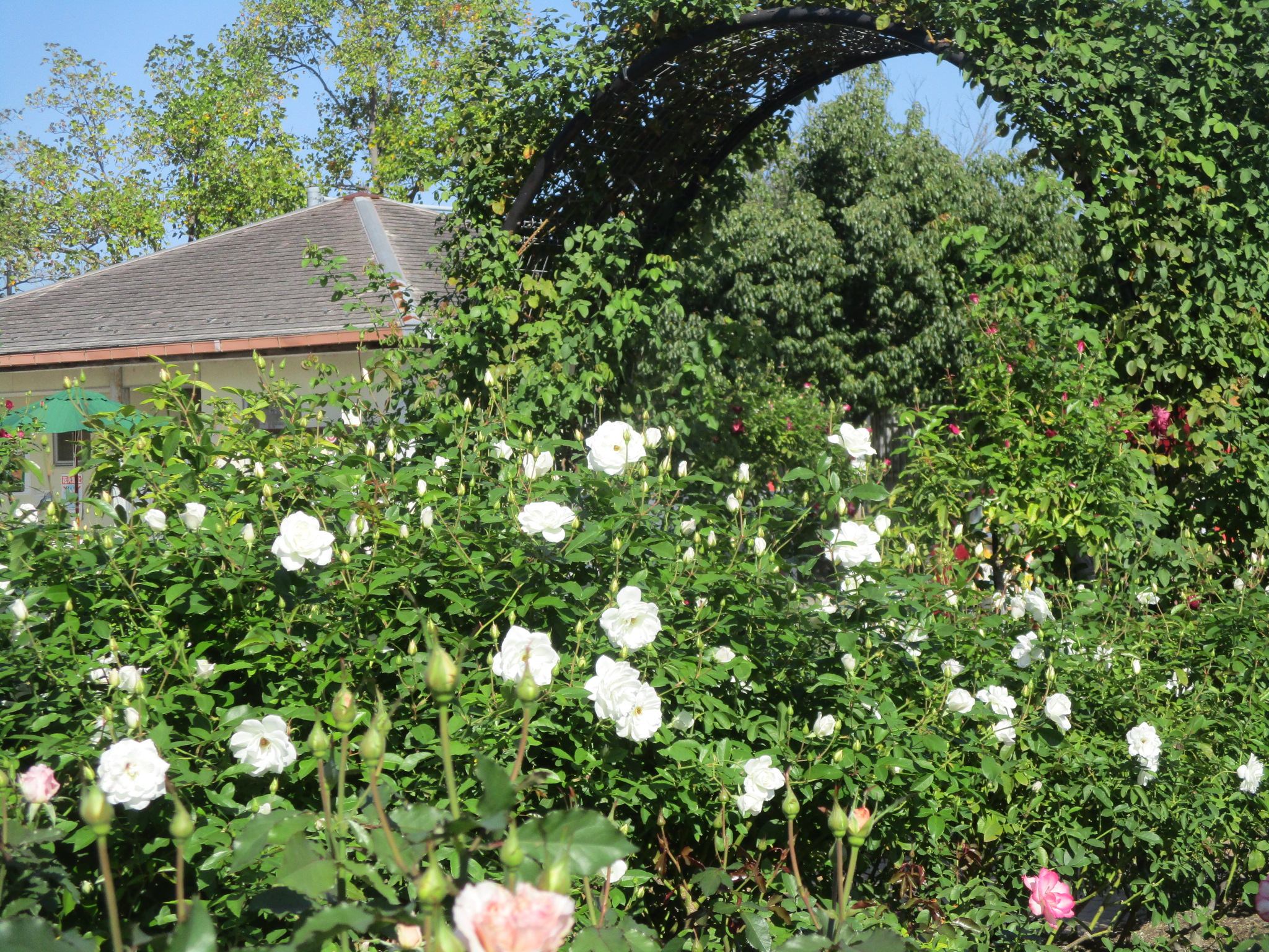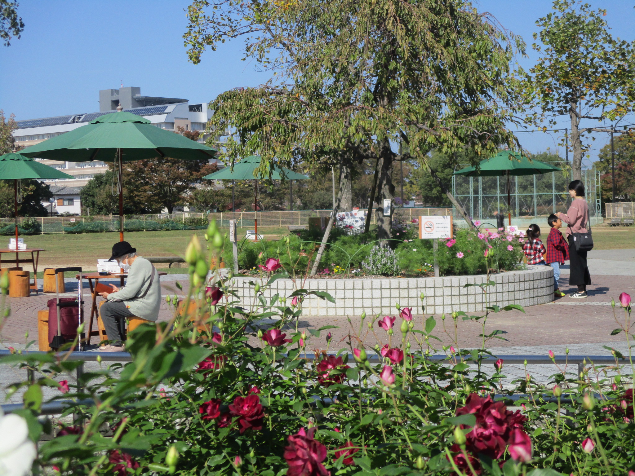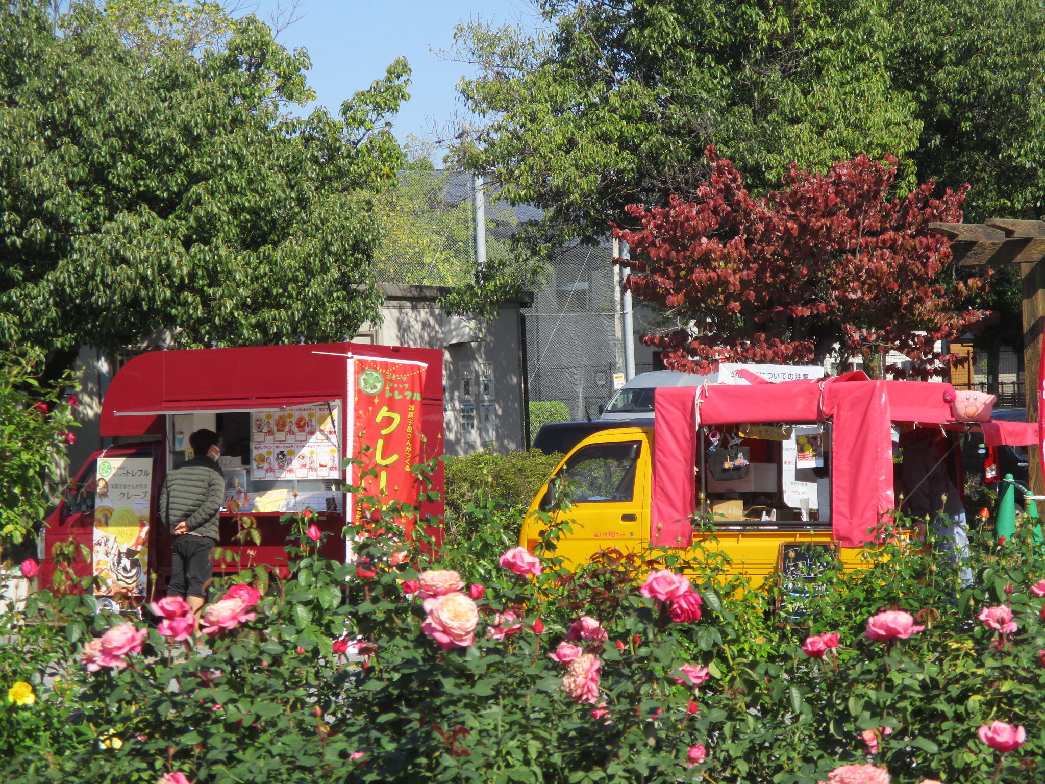 バラの開花状況について② 10月30日現在のバラ園の様子です。 先週の寒さも一旦和らいで小春日和の過ごしやすい気候になり、庄堺公園のバラも見頃を迎えています。 公園の木々も色づき始め、香り漂うバラ園を引き立ててくれています。 現在開催中の「バラCafé秋」ですが、明日10月31日は生憎の雨予報ですのでフードカーによる販売は 中止いたします。11月1日が「バラCafé秋」の最終日となりますので、是非この機会にご来園ください。
